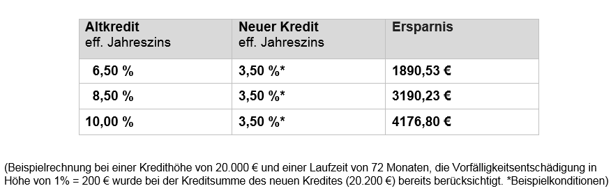 Gut zu wissen: Ratenkredite können anders als Baufinanzierungen jederzeit abgelöst werden. Dies ist gesetzlich festgelegt. Die Bank darf für die Ablösung maximal 1 % der Restsumme als Vorfälligkeitsentschädigung heranziehen. Das bedeutet für Sie, dass Sie mit der Aufnahme eines Neukredites jederzeit Altkredite „umschulden“ können. Ein Vergleich lohnt sich, wie wir Ihnen in folgendem Beispiel zeigen: